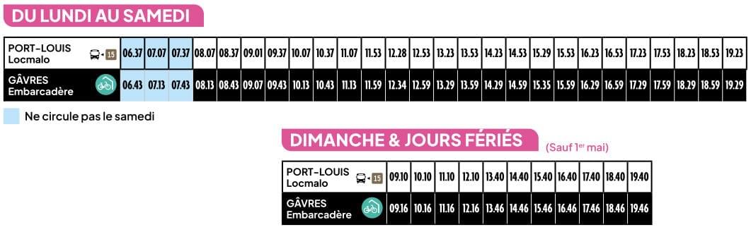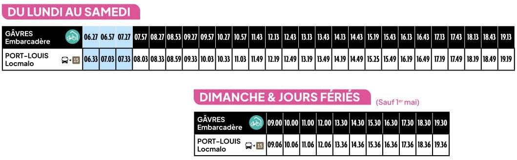 Le Trait d'Union circule environ deux fois par heure avec un dernier départ de Port-Louis à 19h23 et de Gâvres à 19h30.