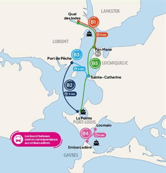 Plusieurs navettes en bateau permettent d'aller d'un port à l'autre. La navette entre Port-Louis et Gâvres est la ligne B4, dénommée le "trait d'union", dont le trajet dure moins de 6 minutes.