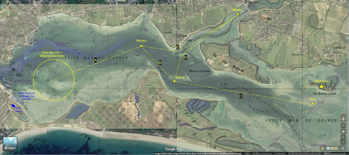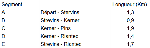 4 marques de parcours seront positionnées, dénommées Stervins, Riantec, Kerner et Pins. Elles détermineront 5 segments désignés par les lettres A, B, C, D et E.
